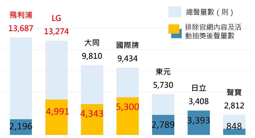再進一步排除官方主動露出的內容、活動、抽獎文章,以篩出實質的網友討論率,可以發現老牌大廠國際牌逆轉勝出,韓牌 LG 和大同虎視眈眈,表現同樣不俗。