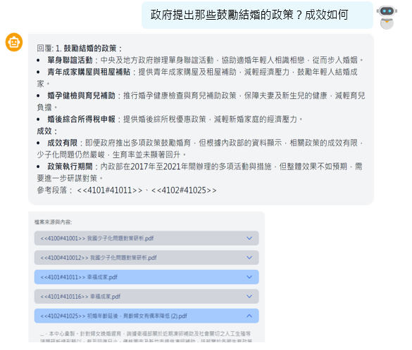 以「循證治理」的實務應用為例,系統曾協助公部門深入研究「少子女化及晚婚不婚」等複雜社會課題。透過分析社群輿情數據、利害關係人的相關討論內容、施政成果、論文期刊及結構化統計數據等資料,回答用戶的問題。