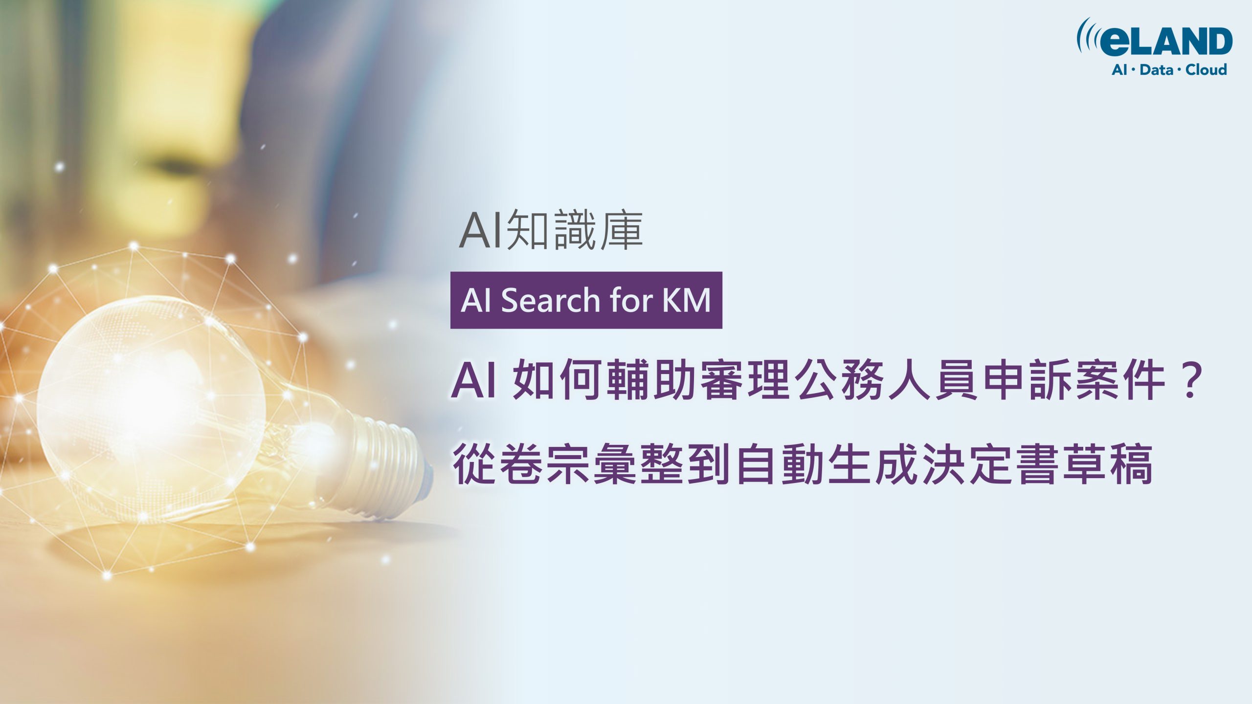 公務文件語言嚴謹且結構複雜,意藍結合深耕多年的 NLP(自然語言處理) 與搜尋技術,能精準判讀繁體中文的法律語境。此外,意藍的「新一代GenAI知識管理工作平台 AI Search for KM」是能快速整合機關既有的卷宗,提供高安全性、高精準度的 AI 輔助環境,為推動數位轉型與智慧治理的最佳夥伴。