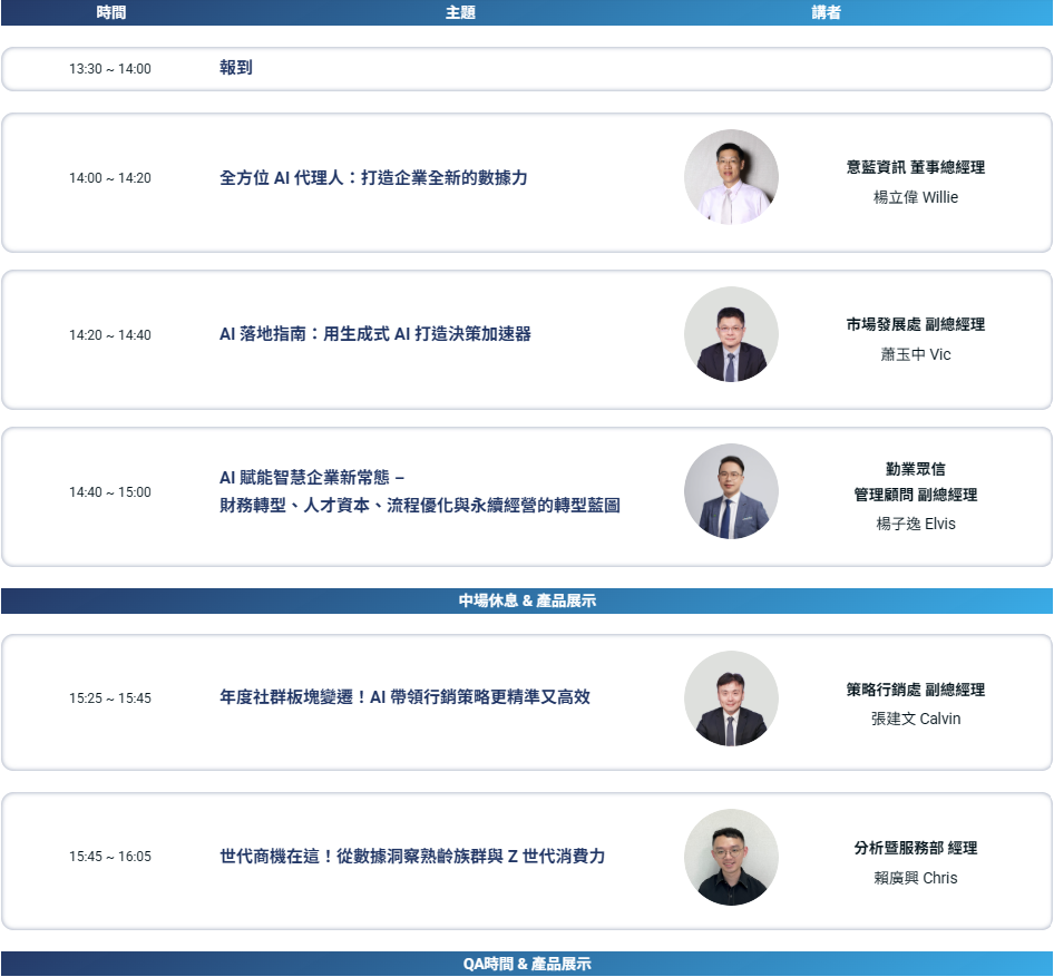 在「全方位 AI 代理人:打造企業全新的數據力」議程中,我們分享了隨著人工智慧技術不斷創新突破,企業品牌能透過 AI 代理人做到的是越來越多,例如在主動判斷模組並生成資訊、即時掌握宏觀資訊等,提升作業效率,也開拓了企業提升各項決策精準度的可能性。針對此趨勢變化,意藍資訊的 AI Agent 便提供企業組織更加智慧化的應用。